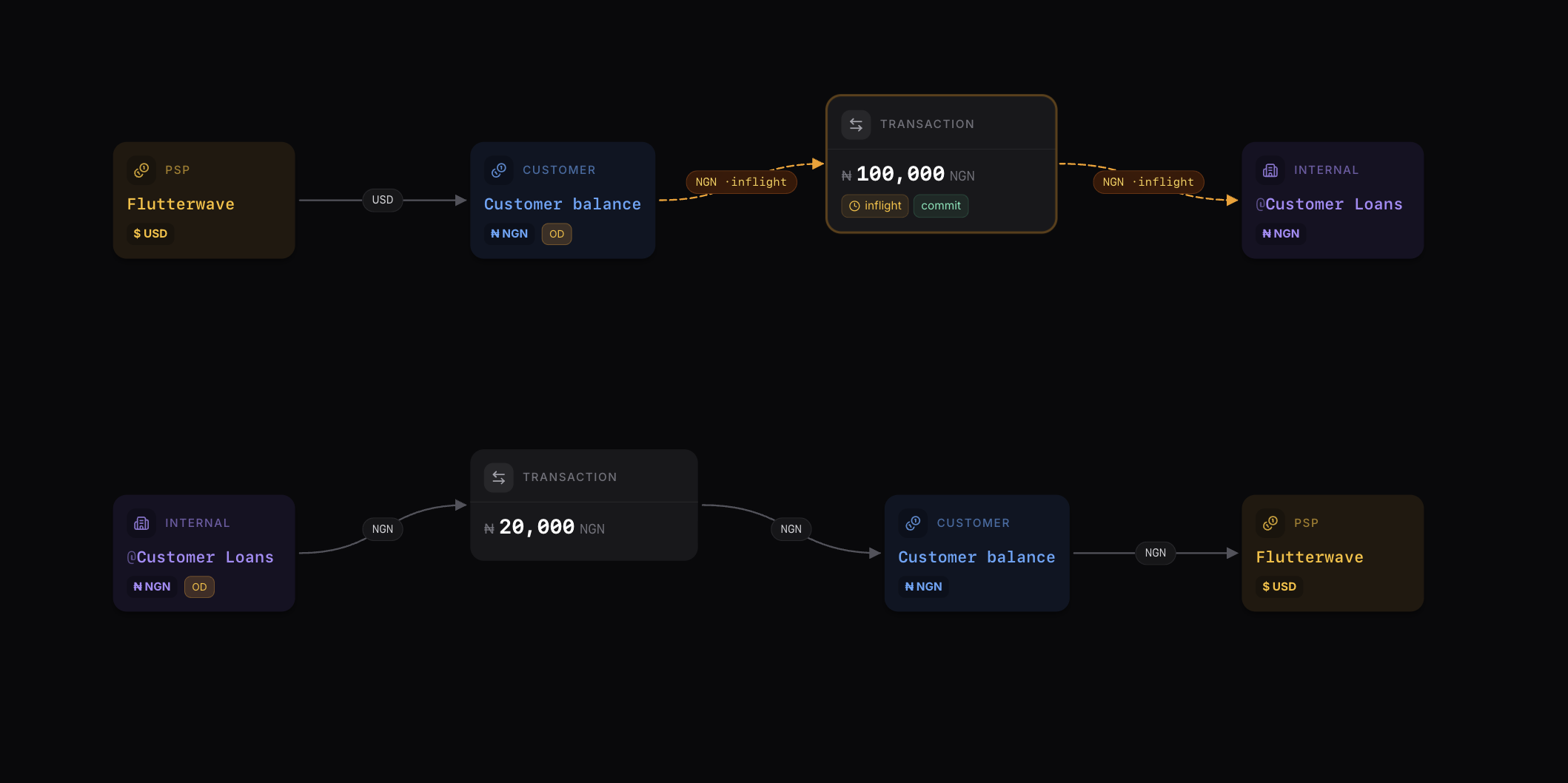 Customer balance→@CustomerLoans-NGN. - Repayment (bottom flow): Money comes into Flutterwave when the customer transfers funds to their virtual account. On the ledger, Blnk records this as