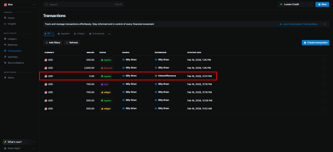 Since, interest revenue is a balance we (Lumen Credit) own, we will use the internal balance feature to specify that.